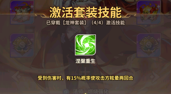 四件套技能:涅槃重生受到伤害时,有15%概率使攻击方眩晕两回合