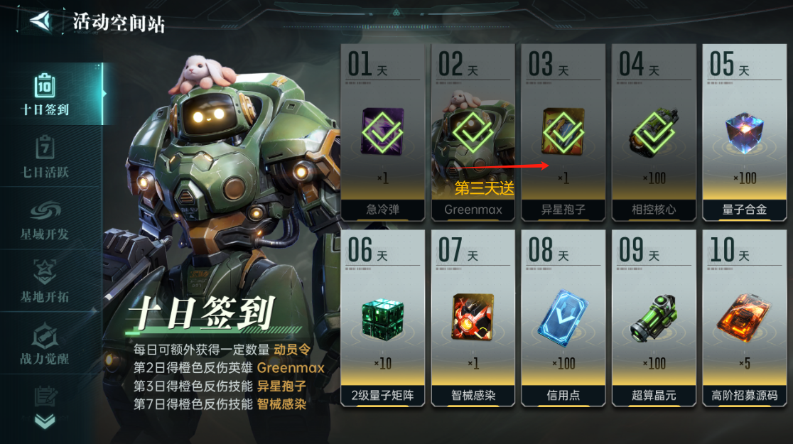 1、新手在第二天游戏签到活动会送一个强力金色反伤英雄Greenmax该英雄主动技能萌力守护可以降低敌人的伤害抗性,自己肉的同时降低敌人的坦度,是个非常强力的反伤英雄