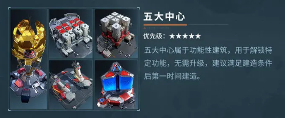 区别于基础建筑,功能性建筑不需要升级,只要达成条件建造出来即可,总共是五个不同的中心设施,分别是探测、训练、贸易、探索和模组,把它们全都建造起来以后就可以解锁邮件和赛季进度、天梯挑战、兵种装备等一系列功能,这些建筑主要需要科技等级达到要求才能解锁,但是每一种功能都至关重要,都是拿到丰厚资源的途径。