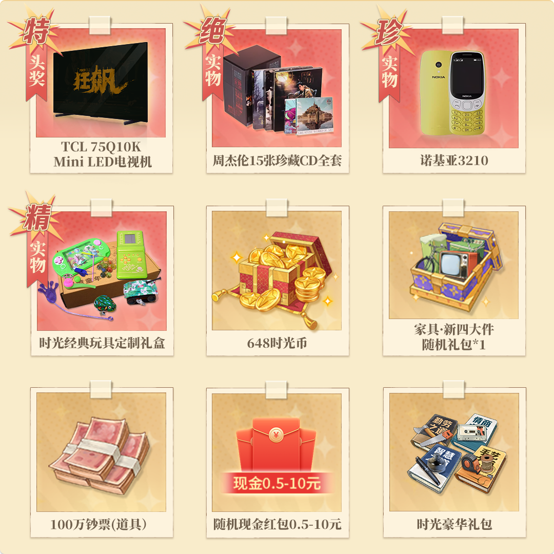 前往微信公众号,进入时光活动小程序,风浪越大,鱼越贵!集狂飙卡牌,超万元75寸MiniLed电视、周杰伦15张CD全套、诺基亚3210、时光定制玩具礼盒、时光币、百万钞票、现金红包等奖品拿到手软!提前预祝老板们统统欧皇附体!