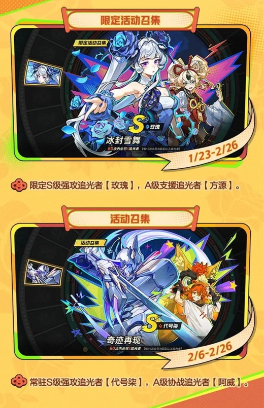 1/23-2/26 限定S级强攻追光者【玫瑰】,A级支援追光者【方源】。