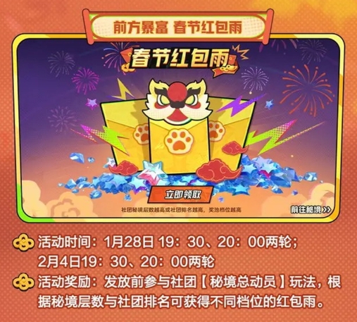 两轮活动奖励:发放前参与社团【秘境总动员】玩法,根据秘境层数与社团排名可获得不同档位的红包雨。