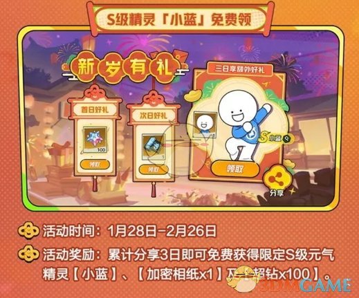 活动奖励:累计分享3日即可免费获得限定S级元气精灵【小蓝】、【加密相纸x1】及【超钻x100】。