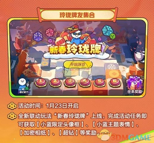 活动时间:1月23日开启全新联动玩法“新春玲珑牌”上线,完成活动任务即可获取〖小蓝限定头像框】、【小蓝主题表情】、【加密相纸】、【超钻】等奖励。