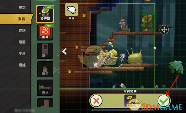 3、接着在建造页面,消耗材料,点击对号即可完成留声机的建造;