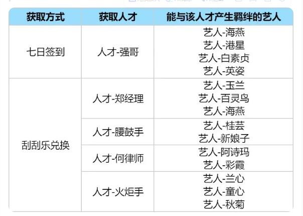 上述橙色专家级别的人才中,【人才-郑经理】、【人才-腰鼓手】和【人才-火炬手】的可产生羁绊艺人相对容易获取,尤其是【郑经理】,其艺人数量众多且获取门槛较低,因此可以作为我们0氪及微氪店长前期发展的首选。