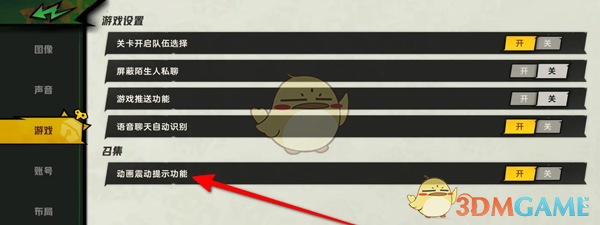 3、然后在游戏设置页面,下滑找到动画震动提示功能,按照需求设置开启或者关闭即可。