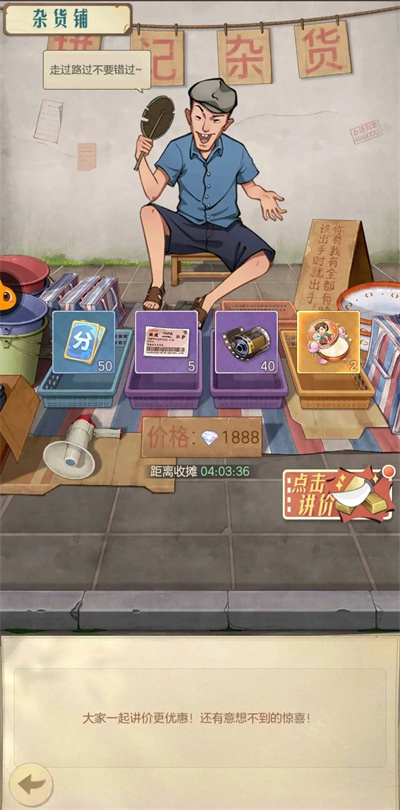 钻石还要用来吃席,可以自己开设宴会,也可以跟其他玩家互相赴宴。饭币每天优先购买旅游车票、阅历卡。公会的限时购物砍价完成后是值得购买的,千万不要错过了。一定要砍价完成后再买。说不定他还会倒贴你钻石。