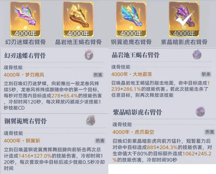 那么在这4个效果中,从直接伤害比例和衍生效果来分析,维一更加倾向于刚翼鹰和紫晶虎这两个选择,因为不仅基础伤害比例不错,同时衍生效果想要达成的门槛也不算很高,大家用的队伍带较多普攻的就可以选择刚翼鹰,其余的则可以选择紫荆虎,另外这两个魂骨在特定的条件和年份下也有双倍攻击的效果,大家可以注意下。