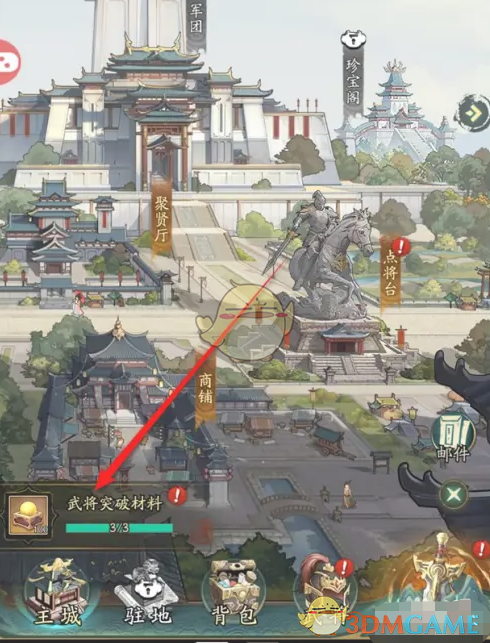 1、首先我们需要进入到游戏主页面,点击主城,然后在左下角的位置点击武将突破材料图标进入。