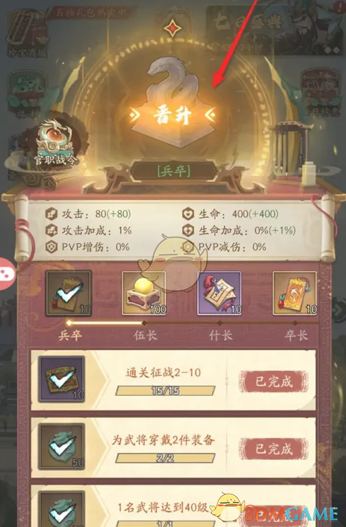 2、满足全部晋升条件【通关征战、为武将穿戴装备、1名武将达到40级】,就可以点击晋升图标。