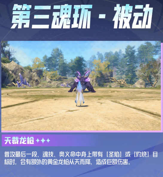 三魂环被动「天裁龙枪」构成关键增伤节点:凡普攻终段、魂技或奥义命中带有【圣焰】或【灼烧】的目标,均将触发一次黄金龙枪天降,造成额外高额物理伤害。该效果无内置CD,依赖火属性状态覆盖率,与火系辅助角色存在天然协同优势,亦可通过自身技能链维持状态延续。