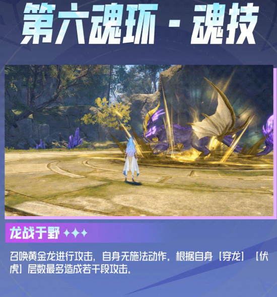 六魂环魂技「龙战于野」为无读条召唤技,全程保持角色行动自由,彻底规避连招中断风险。其实际攻击段数与【穿龙】【伏虎】层数正相关,层数越高,黄金龙发动的攻击次数越多,总伤提升显著。该设计反向强化了前期双架势轮换与层数管理的重要性,使每一层积累都直接转化为最终爆发的确定性收益。
