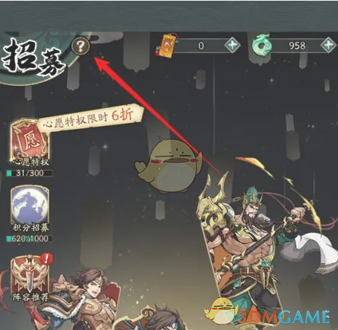 2、在点将台页面点击左上角招募边上的问号图标进入。
