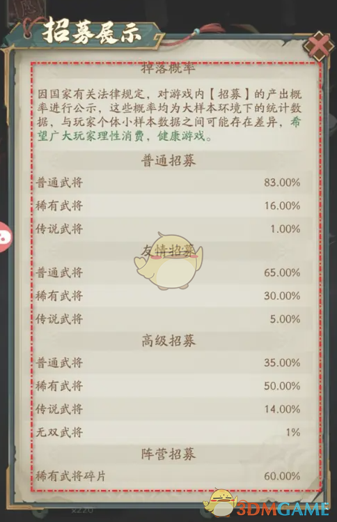 3、触发招募展示的弹框提示,可查看对应的掉落概率,包含:普通招募、友情招募以及高级招募和阵营招募。