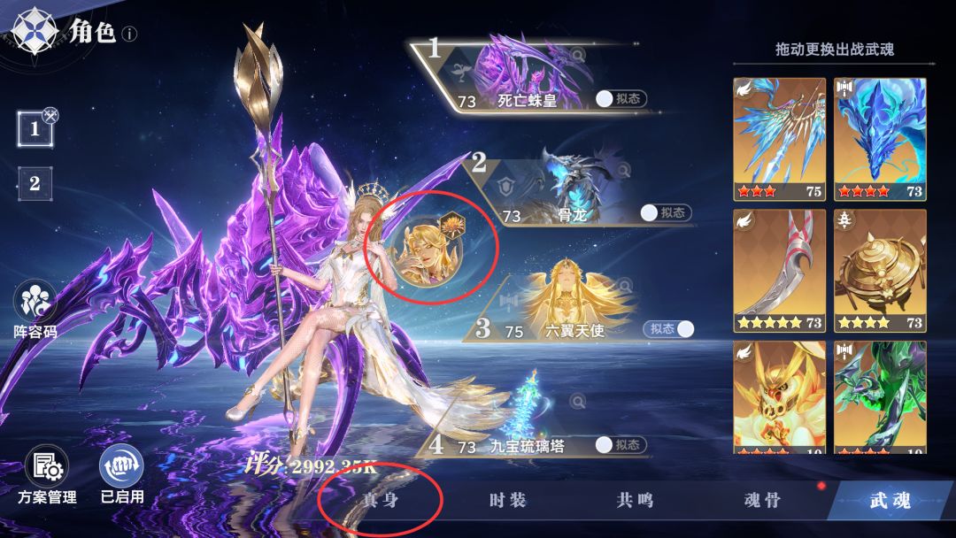 装配入口:角色阵容界面,一队二队不可共用同一武魂真身,每队仅能上阵1个。