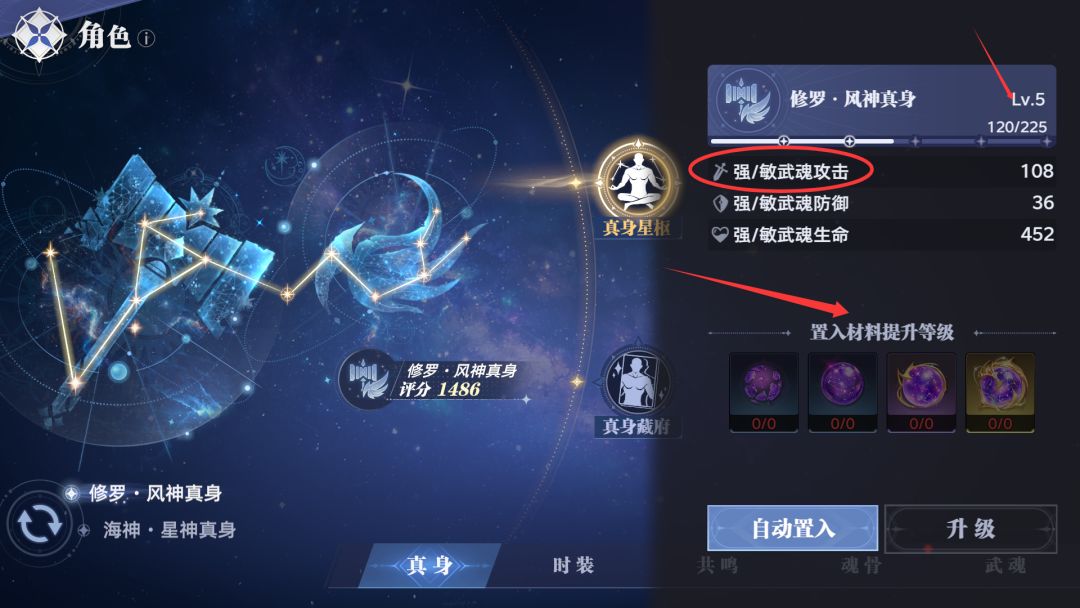 定位:提升真身等级,强化基础属性;强敏攻(修罗风神)与控防辅(海神星神)等级不互通,优先拉满强敏攻系 。