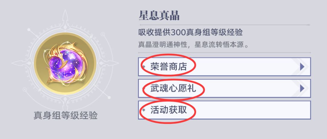 星息晶石:荣誉商店(宗门商店)每周5个必换;武魂心愿礼(每日3元礼包,有预算可购);限时活动、天斗皇礼宝箱。