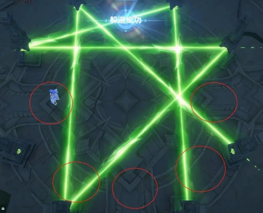 下图中标注出来的红色圈圈,都是靠边缘的位置,这些位置是相对比较难好躲射线的,大家可以适当的选择站位,总体来讲过关的难度并不算很大。