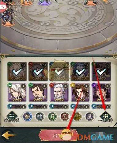4、在试炼玩法中,点击一键上阵,然后点击出征;