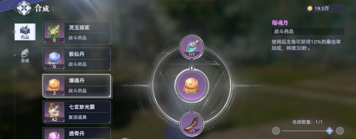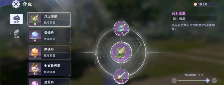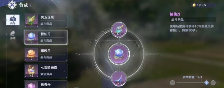 比如说灵玉琼浆,别小看了这瓶药水,它可是能立即恢复你25%的生命值。只需要通过合成玉液瓶和狐尾露这两种材料就能得到。想象一下,在高强度战斗中,你的血量掉得飞快,突然发现一个恢复药品就能瞬间把你从死亡边缘拉回来,这种瞬间逆袭的感觉,谁不爱呢?除了灵玉琼浆,还有极仙丹、爆魂丹等等,这些药品可以有效提升战斗中的各种能力。例如,极仙丹能提升你10%的奥义伤害,而爆魂丹则能带来10%的暴击率加成。当你需要在关键时刻一击制胜时,这些药品绝对能成为你手中的杀手锏。