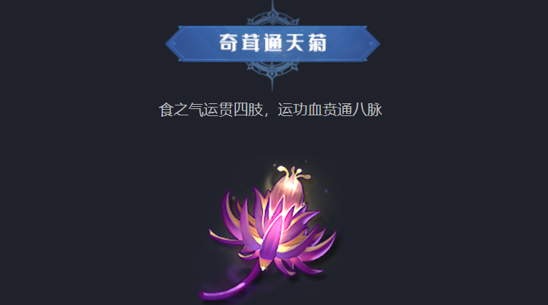 第3种草药的名字叫做奇茸通天菊,它的外形是一朵美丽的紫色菊花,中间的花蕊十分明显,整朵花都散发着金色的光芒,因此同样十分好辨认,可以使玩家们快速突破修炼的瓶颈。第5种仙草叫做水仙玉肌骨,它的外形看上去仙气飘飘,实际的作用是与奇茸通天菊差不多的。