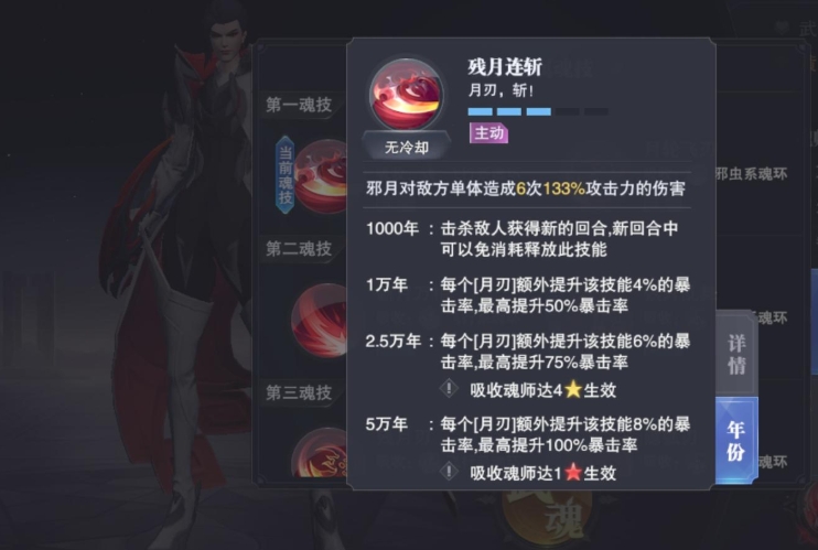 其飞行系一技能残月连斩,收割敌人性命即可刷新,有着高额暴击加持,在这一套魂环搭配中,第一击威力超强,务必优先瞄准敌方关键人物释放,当魂环达到1000年时,击杀敌人便能开启新回合,在新回合里可免消耗再次施展该技能,到了1万年,每个月刃能额外为该技能提升4%的暴击率,最高可提升至50%,2.5万年时,每个月刃让技能暴击率再提升6%,上限达75%、