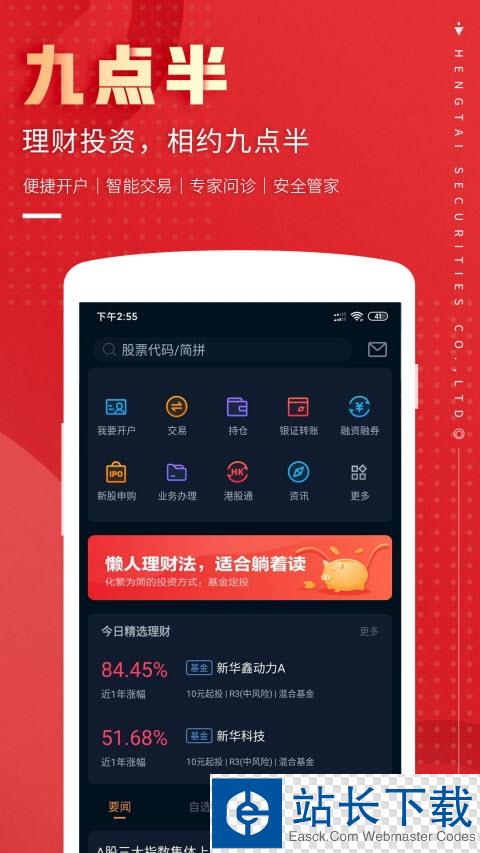 恒泰九点半app是恒泰证券为广大投资者打造的一站式财富管理APP。恒泰九点半app为用户提供沪深股票、港股、ETF、科创板、现金管理、公募基金、私募基金、稳健理财等全面的投资理财机会,投顾老师专业的投资咨询服务,以及个性化的资产配置解决方案。