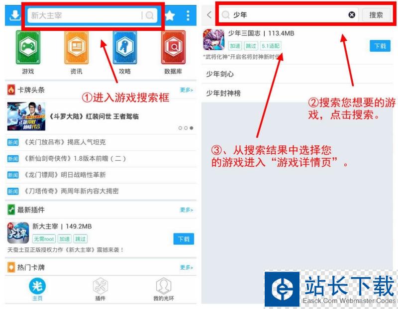 ① 下载安装助手到手机上并运行,点击助手“主页”上方搜索框进入搜索页面。在搜索框中搜索游戏名称,如想查询“少年三国志”,则输入“少年”。从搜索选项中选择点击您所需要的游戏,如“少年三国志”,进入游戏详情页。