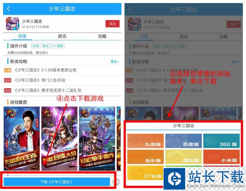 ② 在游戏详情页下方点击“下载《少年三国志》”。选择您所想要的游戏平台,点击平台按钮进行下载。