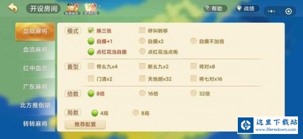 2.打开好友房,可以进行设置,在这里可以选择模式,他有血战到底和血流成河模式,玩家可以选择一个模式,然后点击“一键开 房”。