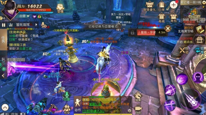 5、友盟新玩法——玩家可以进入友盟领地,并可以参加洞天福地,血盟镇妖,血盟神兽(不能参与roll点)。