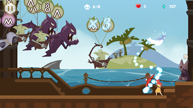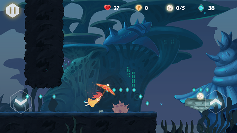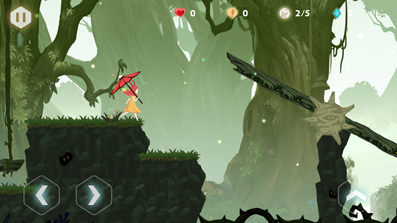 2、飞行跑酷:带着你的小红伞飞起来吧!你可以在飞行过程中收集各种水晶,它们是你能够开通下一篇章的重要道具;