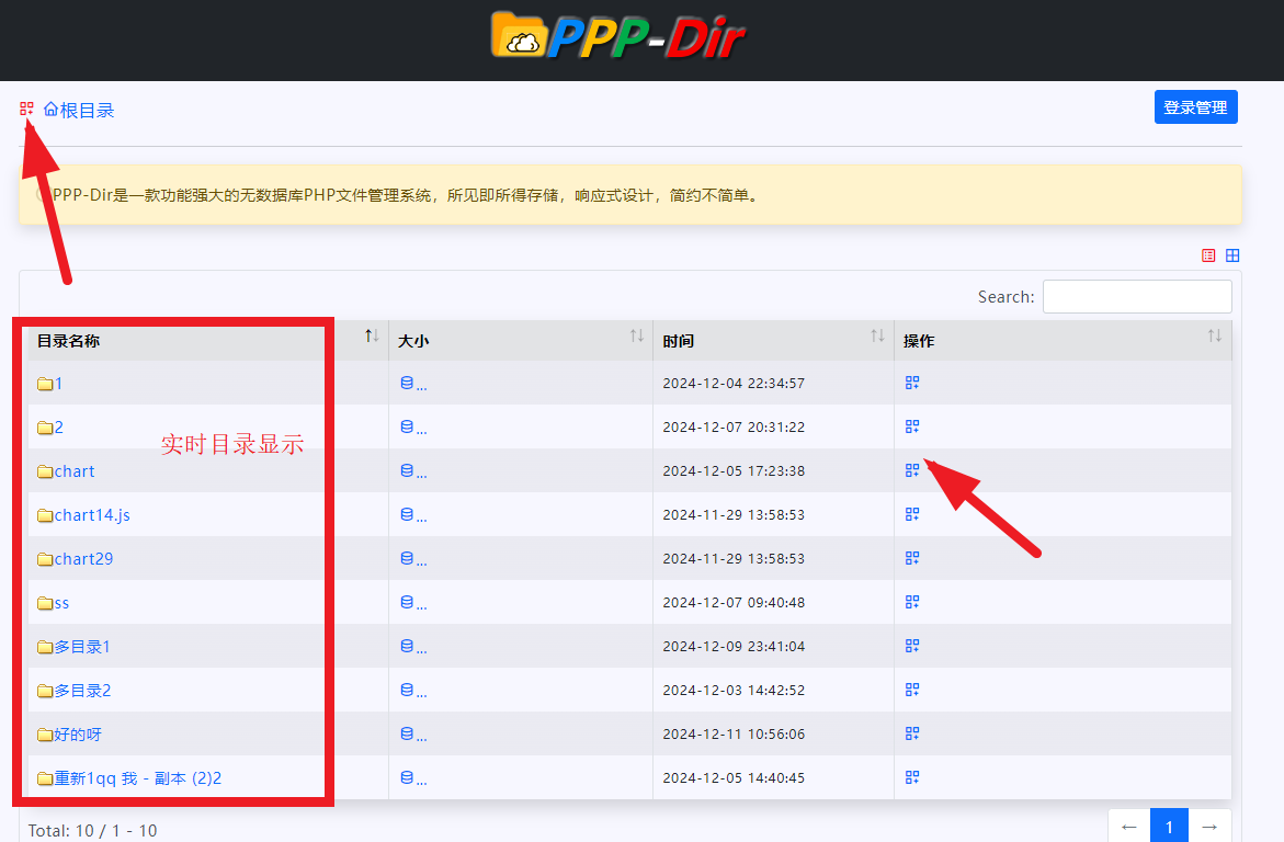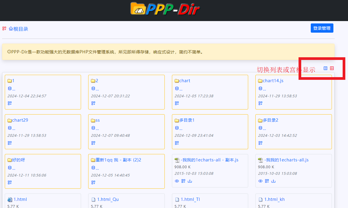 PPP-Dir无数据库云盘系统 最新版(PHPDisk Personal Professional Directory Manage)是一款功能强大的无数据库PHP文件管理系统,所见即所得存储,响应式设计,简约不简单。这里下载站为您提供PPP-Dir无数据库云盘系统 最新版下载,欢迎您使用这里下载站安装体验!