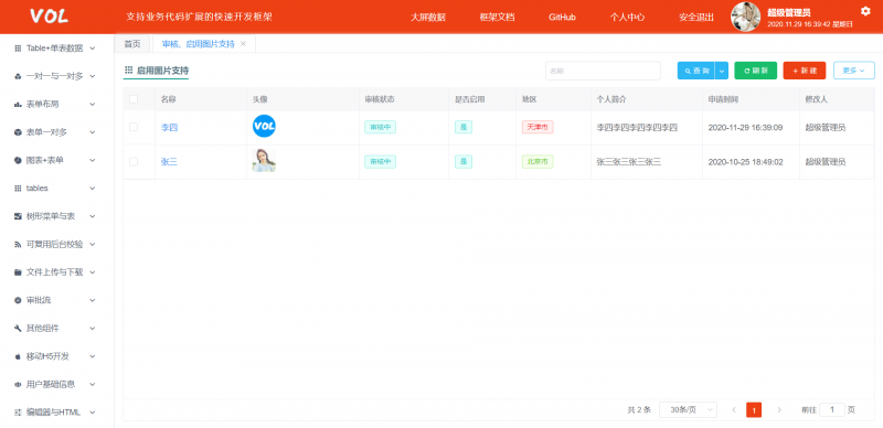 整个启用图片支持、审核表单的所有前后端代码,全部由代码生成器生成,并支持并后端业务代码扩展,审核功能需要在菜单配置权限、代码生成器中勾选启用图片支持