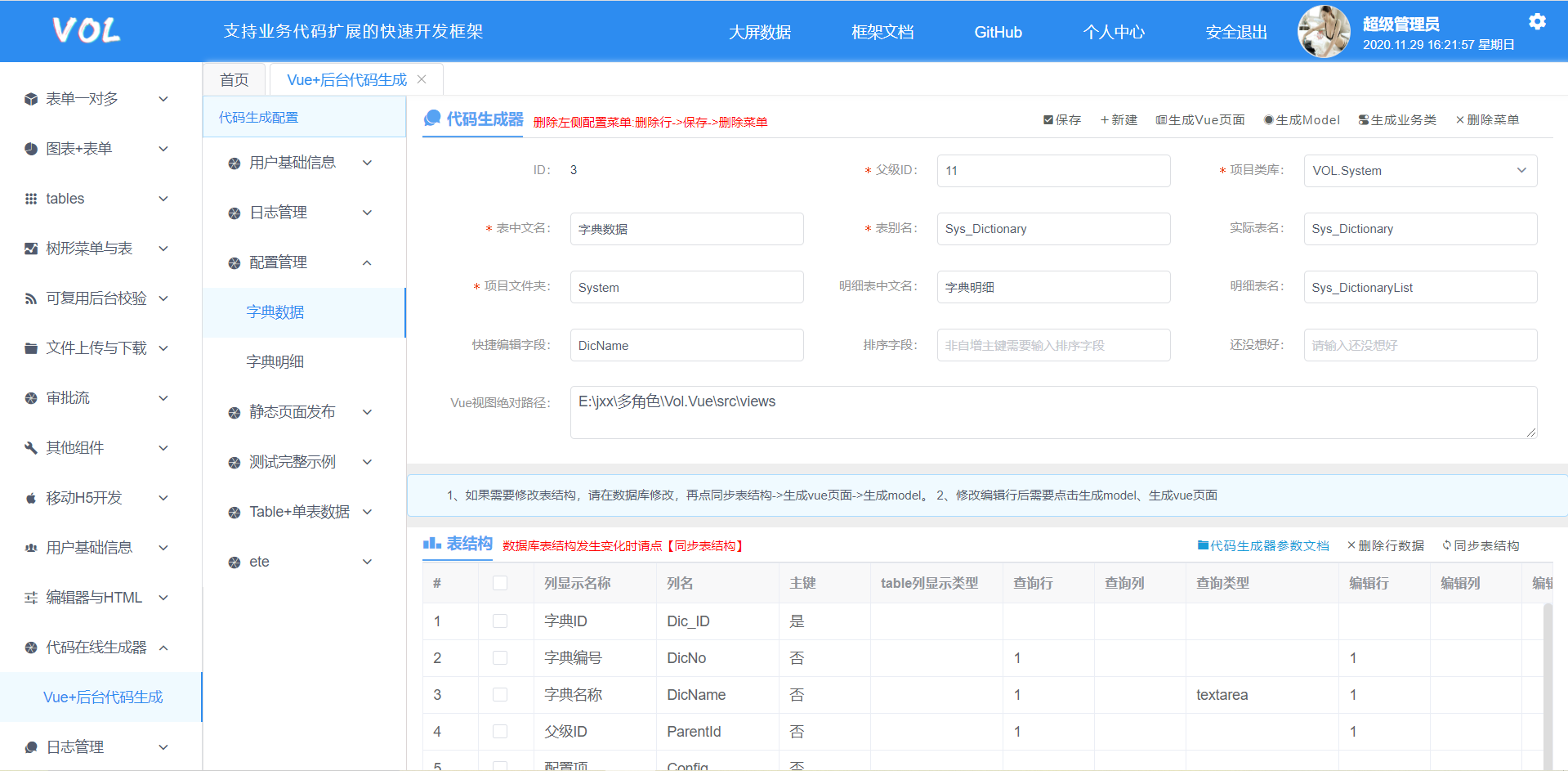代码生成器提供了20多种可配置的属性,可灵活配置显示、查询、编辑、导入、导出、主从关系等功能点击看代码生成器文档