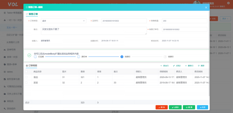 主从表新建、编辑所有前后端代码,全部由代码生成器生成,并支持并后端业务代码扩展,新建、编辑从表配置、字段、类型(下拉框、日期、TextArea等)、所在行与列、字段是否只读、标签显示的长度等都由代码生成器完成,不需要写任何代码
