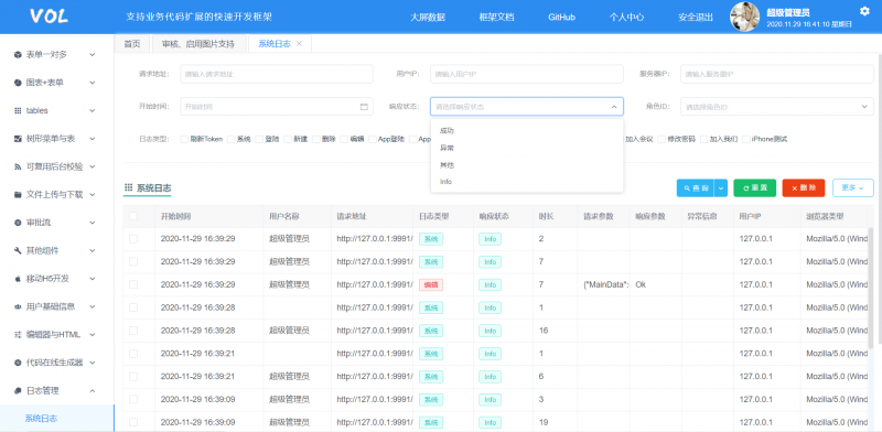 整个表单的所有前后端代码,全部由代码生成器生成,并支持并后端业务代码扩展,查询字段、类型(下拉框、日期、TextArea等)、所在行与列都由代码生成器完成,不需要写任何代码