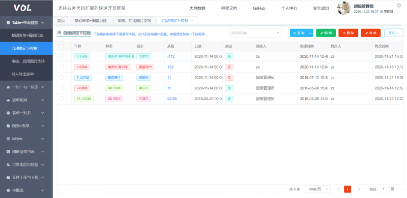 整个自动绑定下拉框数据表单的所有前后端代码,全部由代码生成器生成,并支持并后端业务代码扩展,在代码生成器中只需要指定数据源编号,页面加载时会根据编号自动加载数据源并绑定