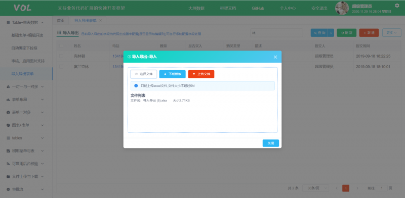 excel导入整个页面都由代码生成器生成,导入的字段、字段是否必填,下载模板也由代码生成器上配置(自己根据实际需要决定是否采用此方法),导入时会验证是否为空与数据的合法性,逻辑校验自己实现扩展方法即可