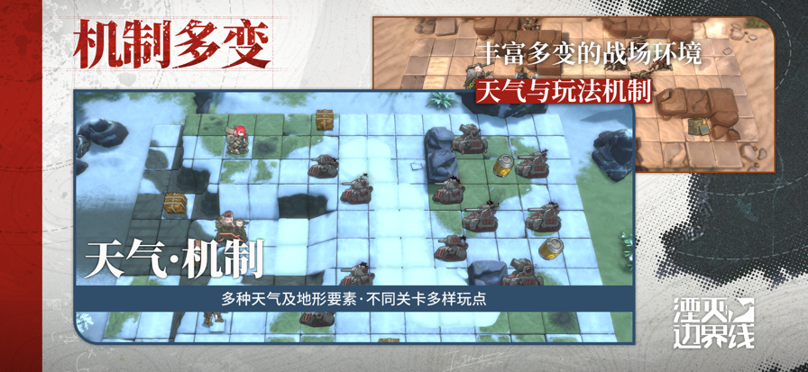 《湮灭:边界线》是一款机甲废土题材的战棋手游。玩家需要在游戏中收集各种角色,安排部队和阵型,并匹配合适的组合阵容来进行回合制的国际象棋战斗。游戏中机甲废土的风格、丰富的地图关卡和大量的任务模式可以给玩家带来不同的游戏挑战。