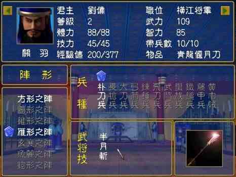 这个游戏最吸引人的莫过于武将升级系统及必杀技了。在游戏中,武将只要打胜仗就会获得经验值,只要达到一定的等级,就会升职,同时获得一项更新更强的必杀技。而每名武将可升3次职,第一次需10级、第二次需20级,第三次需40级,也就是说,最终可以拥有4项必杀技(在游戏开始时每名武将就已经有了一项必杀技)。