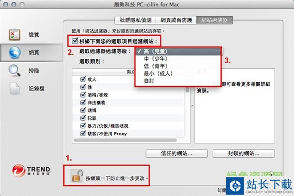 透过简易的网站分级设定,您可以轻松的为家中的孩童过滤有害的网站,让您的宝贝远离色情、暴力。并特别规划程序监控功能,就算不能随时在家,也能帮助您限制孩童使用电脑及上网的时间的管理模块。