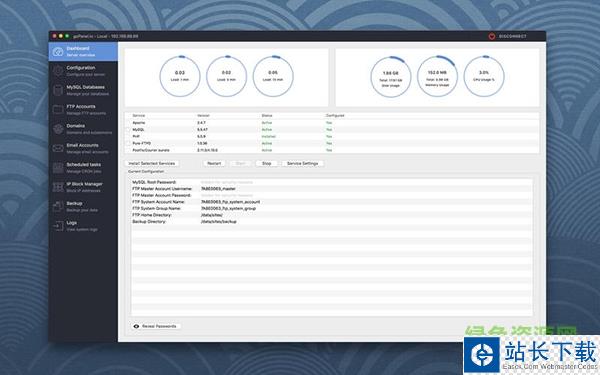 goPanel是Mac平台的实用的服务器管理工具,通过SSH连接上服务器,然后就可以通过goPanel方便的控制服务器了,goPanel Mac版支持安装和配置Apache、php、mysql、ftp、email等,很不错!