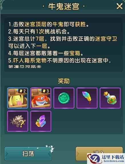 当冒险者达到26级后,会开启此玩法,在牛鬼迷宫玩法中,冒险者需要找到迷宫每层的守护者,并向它发起挑战,挑战成功后才可进入下一层迷宫,除了挑战守护者之外,在每层迷宫中还散落着宠物硬币、随机吓人箱系宠物、随机忠诚口粮、随机技能草等丰厚奖励,需要冒险者进行寻找。