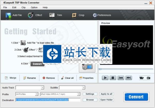 4Easysoft TRP Movie Converter是一个神奇的电影转换器,可以将TRP转换成许多流行的视频格式,如MP4,FLV,AVI,ASF,WMV,3GP,MOV,M4V,MPG,WMV等。此外,这个TRP转换器使用户能够从TRP中提取音频到音频文件,包括m4a,mp3,ac3,aac,wma,wav,ogg,ape。所以你可以在你的便携式播放器上欣赏视频和电影。4Easysoft TRP Movie Converter具有多种视频编辑功能,如调整视频效果、修剪优秀的视频剪辑、裁剪视频以去除不需要的黑色边缘以及在视频上添加水印。