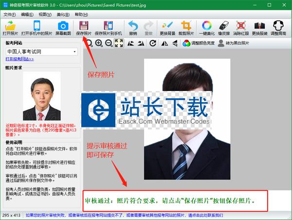 报考照片审核处理软件是一款简单易用的专业照片处理软件,能够帮助用户将照片处理成特定考试类型报名所要求的格式,并且还有更换照片背景和一键美化的功能,十分实用。基本简介 报考照片审核处理软件是一款专业易用的报名考试照片审核处理软件。支持多个报名网站的照片审核处理、支持快速处理照片为标准格式证件照、支持照片裁剪、更换照片背景、一键美化、橡皮擦功能、消除红眼、更换服装、调整肩高等功能。操作简单,审核准确