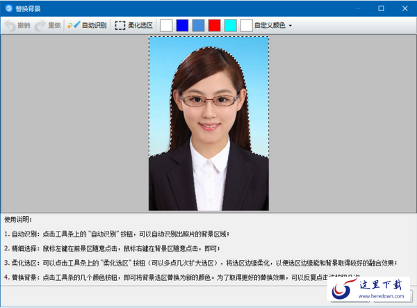 其中虚线为软件自动选择的将要替换的背景部分,如果有误,可按照下方的“使用说明”进行调整。调整完成后,点击“确定”按钮即可完成背景替换,效果如图所示: