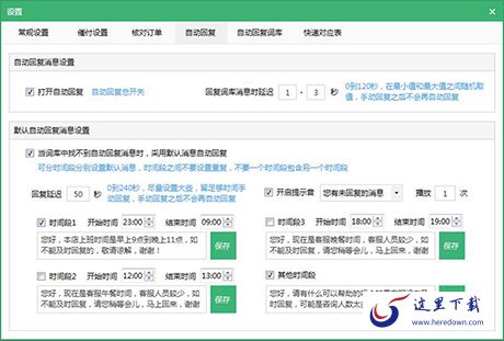 回复设置:可分时间段分别设置默认消息,时间段之间不要设置重复,不要一个时间段包含另一个时间段